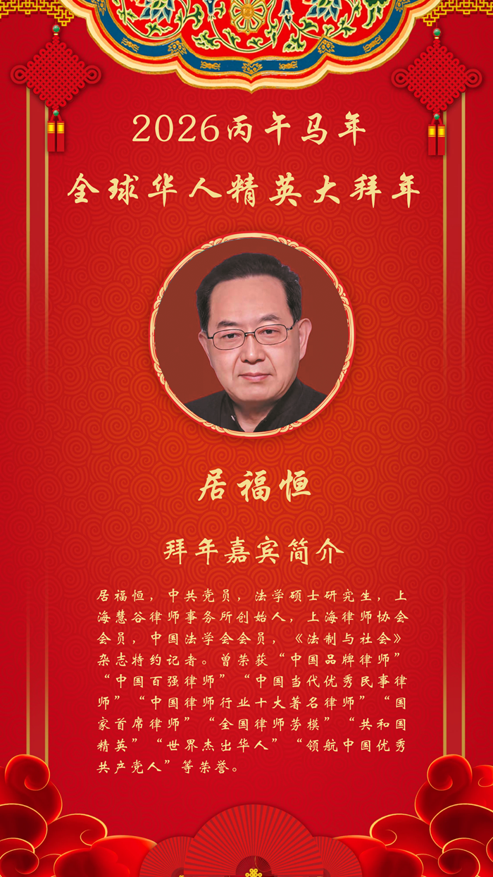 大家好,我是居福恒律师。值此2026年新春来临之际,我谨代表上海慧谷律师事务所向全国律师行业的同仁们,以及长期以来关心、支持中国法治事业发展的全国人民,致以最诚挚的问候和最美好的祝福!