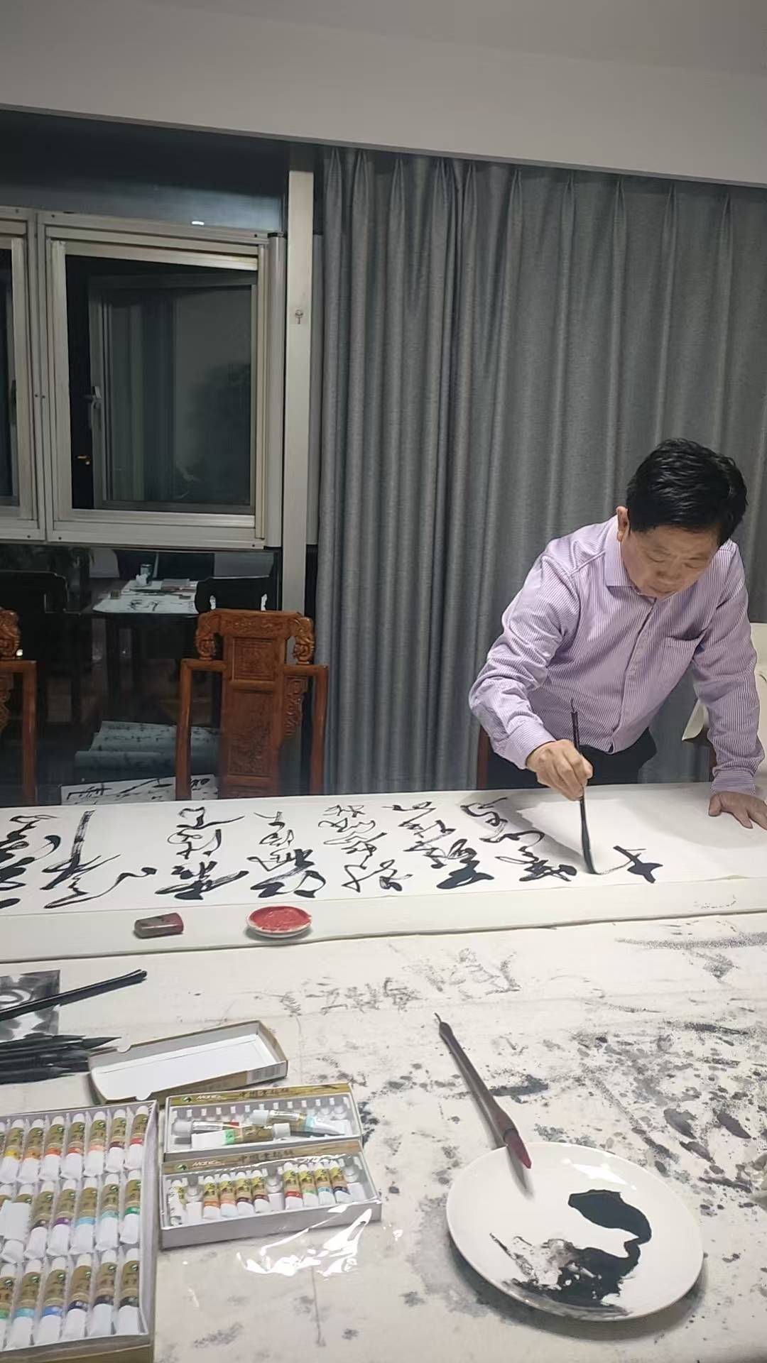 随着他的技艺愈发精湛,社会关注度与日俱增,他时常受邀进行“现场表演”。对此,他有着清晰且明确的认知:“书法艺术和书法表演是两个截然不同的概念。艺术创作是一场孤独的探索之旅,是与笔墨、与自我进行的深度对话,追求的是精神的表达与美学的境界。而表演,则更侧重于视觉的呈现和即时的互动,它是艺术传播的一种方式。二者可以相互结合,但核心绝不能混淆。绝不能为了追求表演效果而损害艺术的本真与法度。”