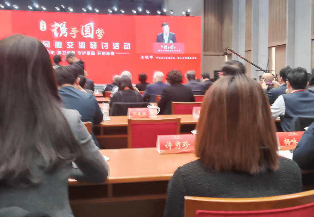 图说:活动现场气氛热烈。共工新闻社中国近代文史顾问钮则坚先生,与台湾中华统一促进党总裁张安乐亲切交流并合影留念。共工社发