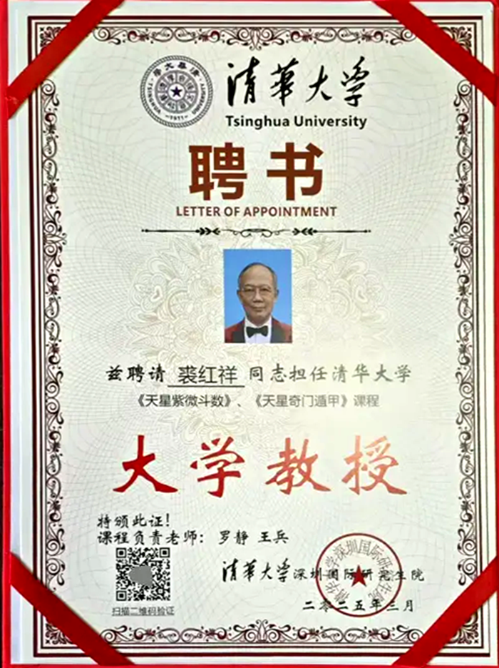 2025年3月,被清华大学聘任为《天星紫微斗数》、《天星奇门遁甲》课程大学教授。