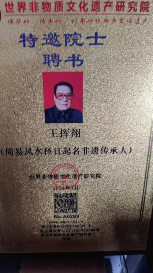 王挥翔大师以其卓越的成就,在学术界和社会赢得了极高的荣誉。他是中国东方文化研究会对外经济文化工作委员会的易学专家委员,肩负着传承和弘扬易学文化的重任。中国国学行业专家委员会授予他“中华国家级风水师”称号,这是对他在风水领域深入钻研的认可,如同“欲穷千里目,更上一层楼”。他站在了行业高处。中国专家百科组委会赠授的“国学楷模牌匾”,更是对他国学素养和实践的崇高赞誉。在2023年陕西易理风水起名大赛中。他如战场上的常胜将军,一举夺得了第一名冠军金奖,那是他实力的明证,亦是他智慧的勋章。他就像一盏明灯,照亮了无数人在生育和取名之路上前行的方向,成为人们心中当之无愧的国学大师。