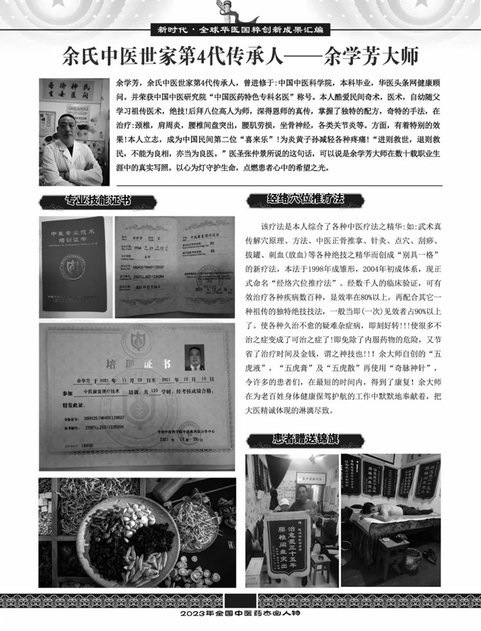 余学芳,余氏中医世家第4代传承人,曾于中国中医科学院中医药科技合作中心学习进修中医康复理疗技术,中医特色诊疗师、传统东方医学专家学会专家委员,华医头条网健康顾问委员会健康顾问。他自幼便对民间奇术、医术展现出浓厚兴趣,跟随父亲潜心学习祖传医术绝技,打下了坚实的中医基础。此后,他又拜多位高人为师,虚心求教,深得恩师真传,掌握了独特的配方与奇特手法,心中也立下了成为中国民间第二位“喜来乐”的远大志向。