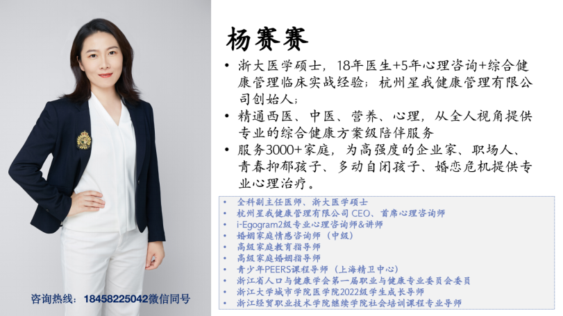 杨赛赛的心理学训练并非一时兴起。她自2002 年起学习临床心理学,并在精神卫生相关方向持续进修。 她还完成上海精神卫生中心青少年 PEERS 高级导师课程训练,支持青少年提升社交行为能力与团体适应能力。