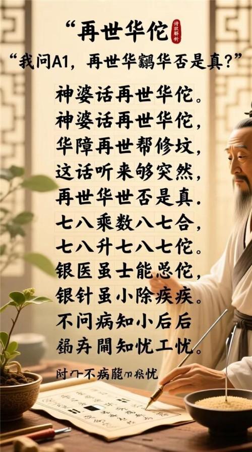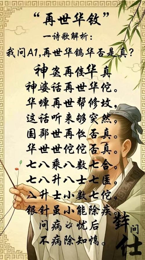 这一句提出了一个问题,质疑“再世华佗”的真实性,暗示着对古代名医华佗再生的期望与怀疑。华佗在中国历史上被视为伟大的医生,象征着医学的智慧。