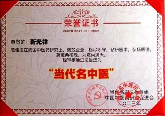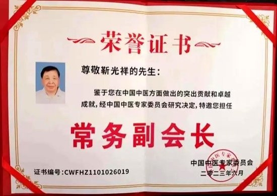 深耕领域数十载,靳光祥收获了无数荣誉:2011年获评中国优秀创新企业家,2017年被国家科技部“海峡科技与产业杂志”认定为“药食同源开拓者”,2018年成为中国管理科学研究院“创新决胜未来”代言人,2019年与屠呦呦一起入选“中国邮票”纪念人物,荣获“中医药亮剑特殊成就人物”天下第一刀奖,还与袁隆平、屠呦呦一同被特聘为决策中国智库副理事长。他还担任中关村炎黄中医药科技创新联盟副主席、中国乡村医师协会《活蛋白治疗艾滋病方案》专家课题组组长等多项职务,用自己的影响力推动药食同源、医养结合事业发展。