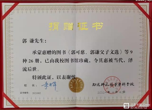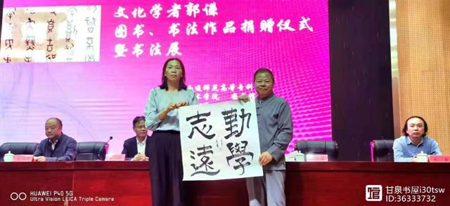 然后,郭谦向南通师范高等专科学校图书馆捐赠26册精品图书和书法作品3幅,其中一幅书法作品为郭谦自撰文章、自己书法的《南通师范颂》,台上主要嘉宾一起合影留念。南通师范高等专科学校图书馆馆长陈红美向郭谦颁发了捐赠证书。