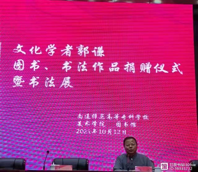 为了弘扬中国传统文化艺术,展示学校知名校友文化传承和创新的成果,赓续传统文化文脉,激励师生奋楫新时代,砥砺新征程。2021年10月12号上午10点30分,南通师范高等专科学校图文信息中心小报告厅举办了“文化学者郭谦图书、书法捐赠仪式暨书法展”,主办单位:南通师范高等专科学校美术学院、南通师范高等学校图书馆。