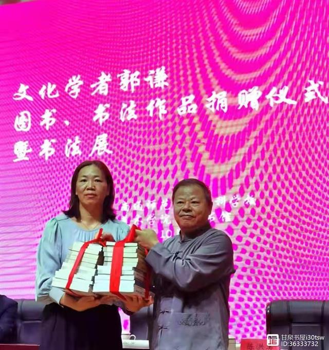 京城作家、书画家、艺术评论家、文化学者郭谦,1957年生,江苏南通人,现居北京宋庄。曾出版文学、文史专著15本,在文学、文史、书画、教育诸多方面成果累累。他负有强烈的社会、历史责任感,北京、江苏、山东、河南、河北、山西六省市十一个城市宣传部、文联、文旅局相继主办了他对博物馆、艺术馆、图书馆、档案馆的公益捐赠活动。2017年以来,郭谦分别向南通市图书馆和档案馆、海门博物馆和图书馆、通州区图书馆、如东县图书馆和档案馆、南通大学图书馆捐赠,这次对南通师范高等专科学校的捐赠是报恩家乡的第六次公益行动。这次活动意义更在于报恩母校,郭谦是南通师范79届学员(原海师中文班),其父亲郭可慈先生是南通师范49届简师班学员,把两代人的文化作品送到母校来,是最好的归宿,将会得到更好的收藏和传播。