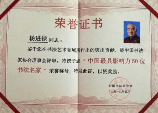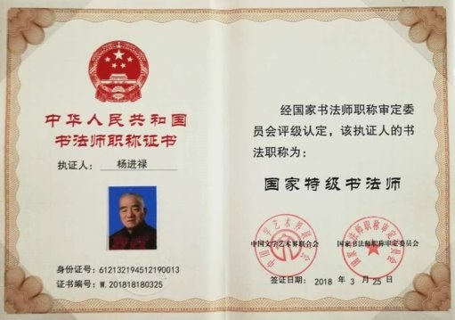 主要成就: 国家特级书法师、国家一级美术师,他于上世纪 70 年代成名,近年达到艺术事业的巅峰,先后被任命为中国书法协会副主席(国际)、国家书画院副院长等职;被评为十大“一代大师”之一、30 名“全国书·画作品最具收藏价值的艺术家”之一。杨进禄,国家特级书法师、国家一级美术师、一级书法师、中国书法家协会会员、中华人民共和国文化部人才艺术中心学部委员、人民日报人民美术栏目版艺术顾问。字林,号在心、笔名向阳、生于 1945 年、陕西合阳人、是当代著名的书画大师和世界文化名人。他演绎着人生的传奇和艺术成就的经典,有齐白石般的出身、磨练和成绩,也有独特军旅生涯,祖国情怀和胡杨精神的交融。