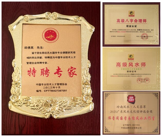 荣誉的背后是汗水与实力的彰显。2025年,在中国品牌协会有限公司举办的品牌优选榜评选中,邱佛英荣获“岭南风水,人文荟萃——2025年广东风水文化馆评选金奖”;同年,他参加《中国高级风水策划师》注册班培训学习,获颁资格证书;2025年10月30日,荣获中国传统文化促进会颁发的《易学文化传承师职业认证证书》。